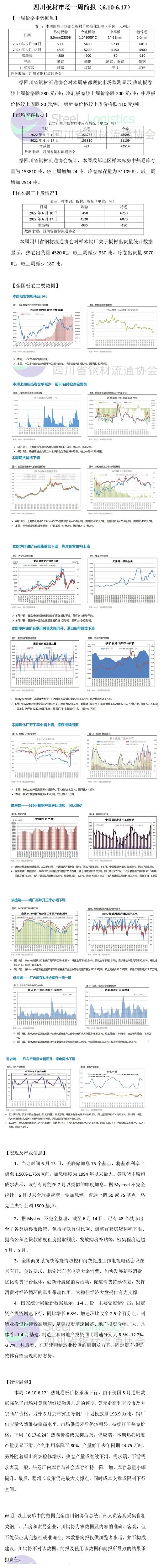 本周(6.10-6.17)热轧卷板价格承压下行。由于美国5月通胀数据强化了市场对美联储继续激进加息的预期,美元走高利空股市及大宗商品价格。另外6月京津冀主导钢厂计划投放量193.9万吨,钢厂供应量依然维持偏高水平,市场供需矛盾仍较明显,持续打压热卷价格。下周(6.17-6.24)热卷价格或先抑后扬。供应端,本期热卷周度产量明显下滑,产能利用率降至80%,产量低于去年同期24.75万吨,另外随着唐山高炉检修增多,热卷产量或继续下滑。需求端,下游需求表现一般,热卷厂内库存与社会库存维持一降一增,库存总量小幅提升。最后,稳增长政策仍是最大支撑点,同时成本支撑或限制下行空间......☟