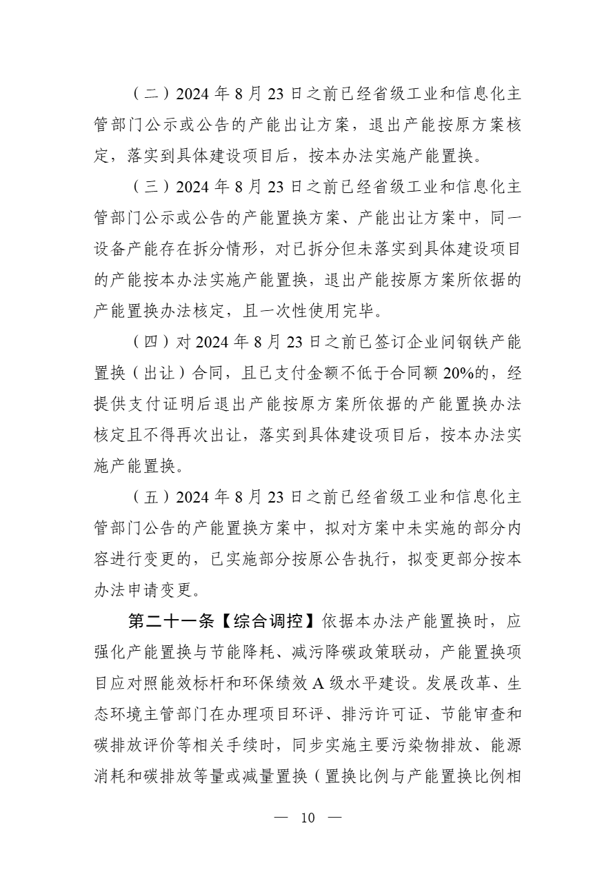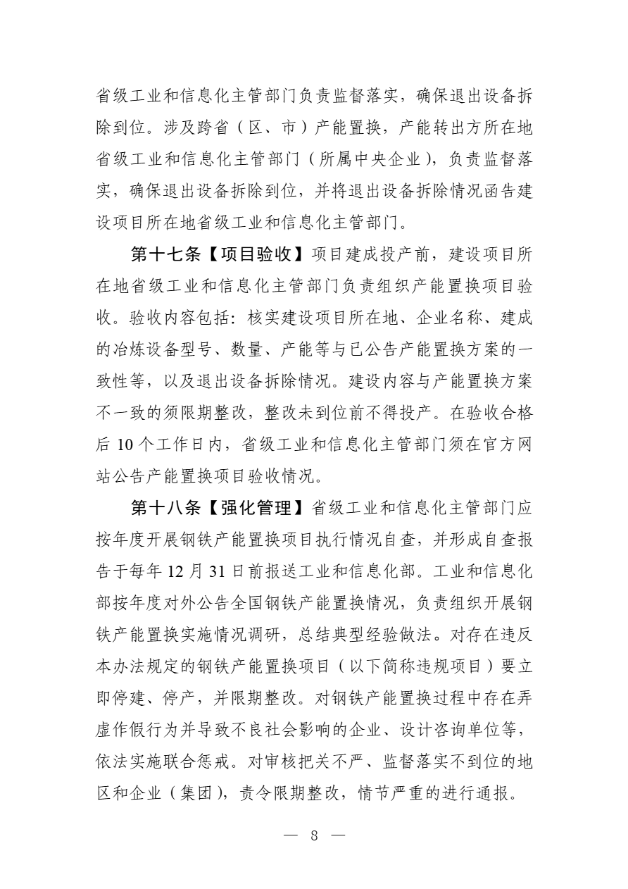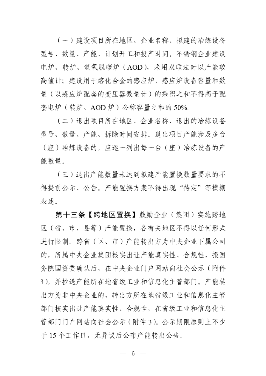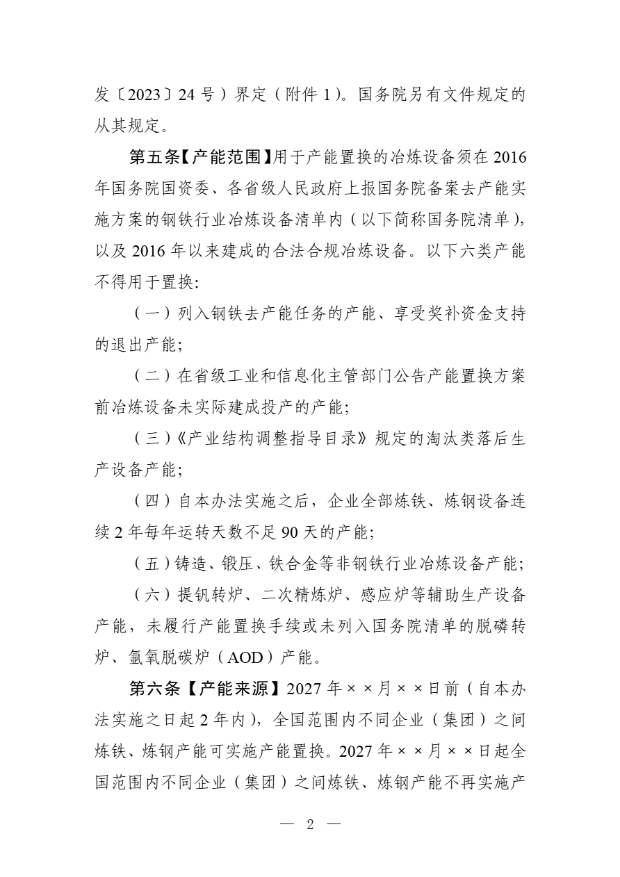 为落实全国新型工业化推进大会部署,加快推进存量产能减量提质、结构优化和转型升级,促进市场供需平衡,推动行业高质量发展,依据国家有关法律法规和产业政策,工业和信息化部对《钢铁行业产能置换实施办法》(工信部原〔2021〕46号)进行了修订,研究形成了《钢铁行业产能置换实施办法(征求意见稿)》(见附件1),现公开征求意见。如有意见或建议,请于11月23日前书面反馈工业和信息化部原材料工业司(钢铁处)。